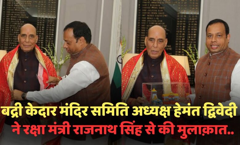 श्री बदरीनाथ-केदारनाथ मंदिर समिति (बीकेटीसी) के अध्यक्ष हेमंत द्विवेदी ने सोमवार शाम नई दिल्ली में देश के रक्षा मंत्री एवं पूर्व भाजपा राष्ट्रीय अध्यक्ष राजनाथ सिंह से उनके आवास पर शिष्टाचार भेंट की।
