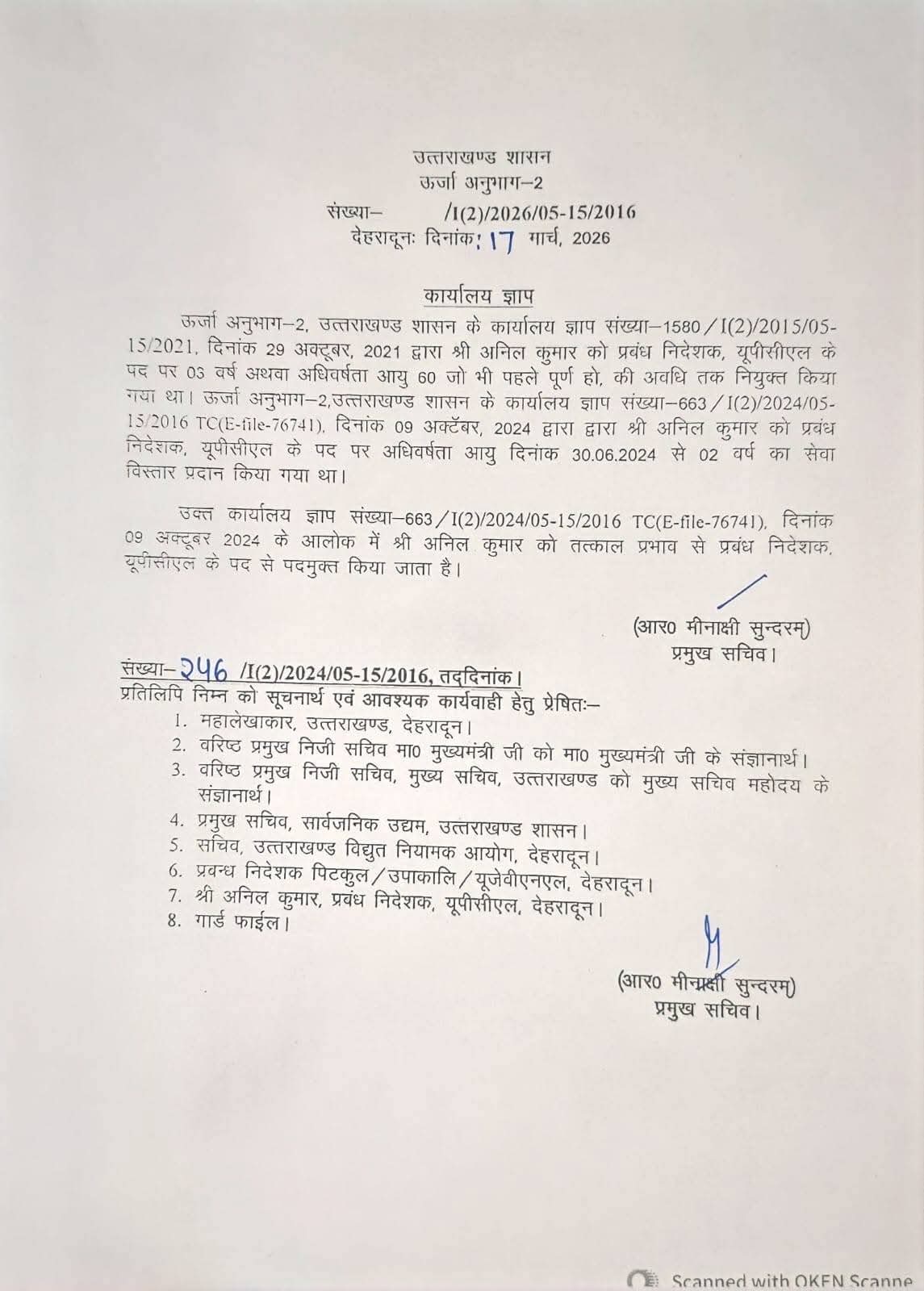 जारी आदेशों के अनुसार, यूपीसीएल के प्रबंध निदेशक अनिल कुमार को उनके पद से हटा दिया गया है।वहीं,यूजेवीएनएल के एमडी संदीप सिंघल को भी पदमुक्त कर दिया गया है।इसके साथ ही यूपीसीएल (परियोजना) के निदेशक अजय अग्रवाल को भी हटाया गया है।