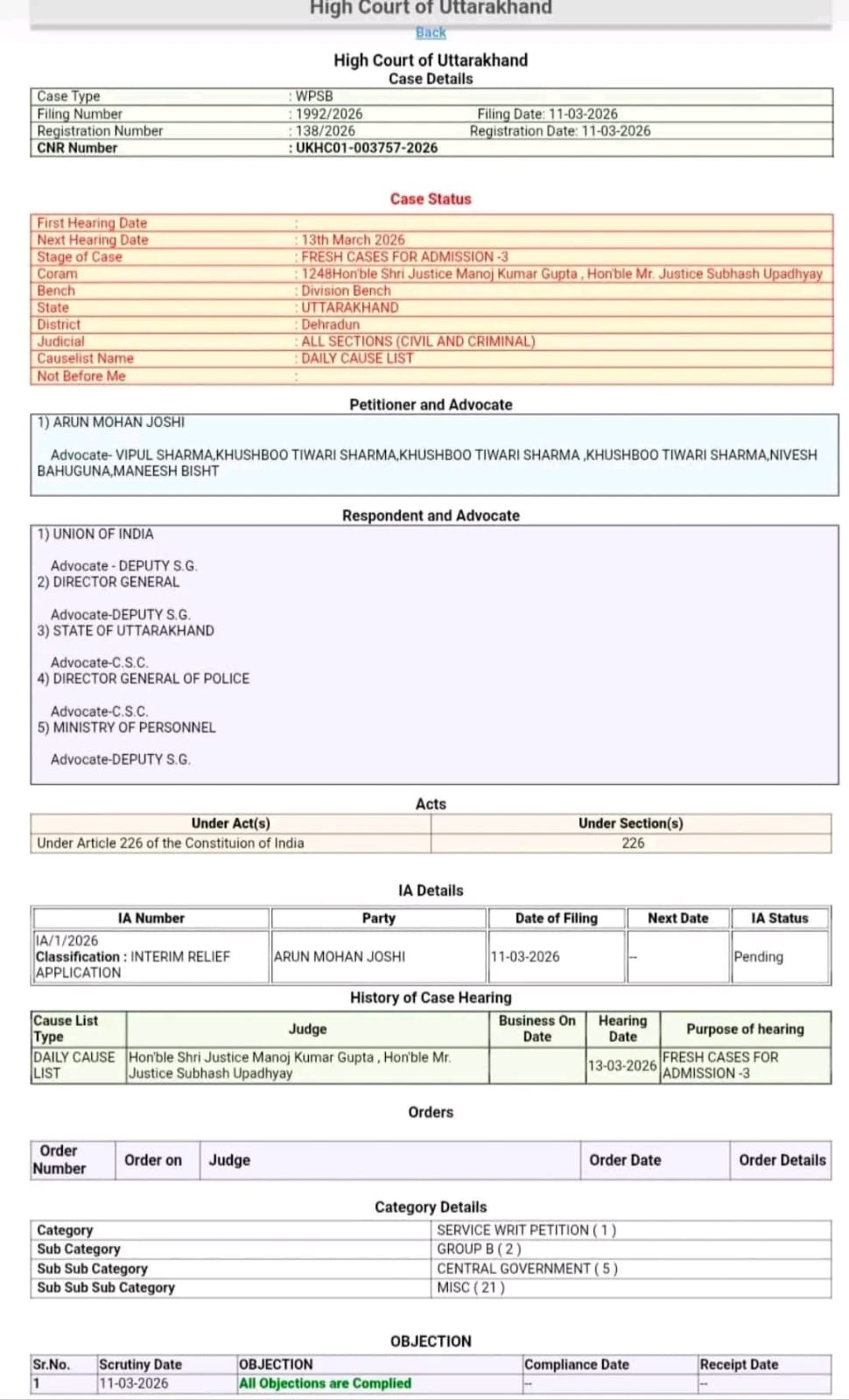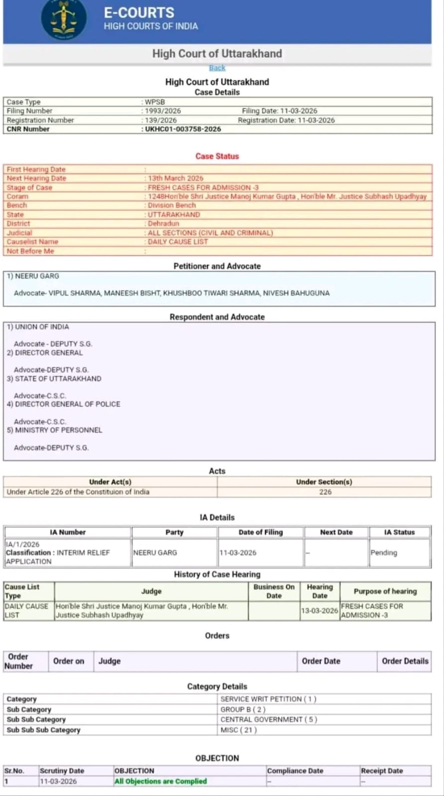 दोनों अधिकारियों ने कोर्ट में याचिका दाखिल कर इंटरिम रिलीफ की मांग की है।जानकारी के मुताबिक उनकी याचिका रजिस्टर्ड हो चुकी है और इस पर जल्द सुनवाई होने की संभावना है।इस मामले ने उत्तराखंड के प्रशासनिक गलियारों में हलचल बढ़ा दी है।केंद्रीय गृह मंत्रालय ने 5 मार्च 2026 को उत्तराखंड के तीन वरिष्ठ आईपीएस अधिकारियों अरुण मोहन जोशी,नीरू गर्ग और मुख्तार मोहसिन के केंद्रीय प्रतिनियुक्ति आदेश जारी किए थे।इसके बाद उत्तराखंड सरकार ने 6 मार्च को अरुण मोहन जोशी और नीरू गर्ग को तत्काल प्रभाव से रिलीव भी कर दिया था।
